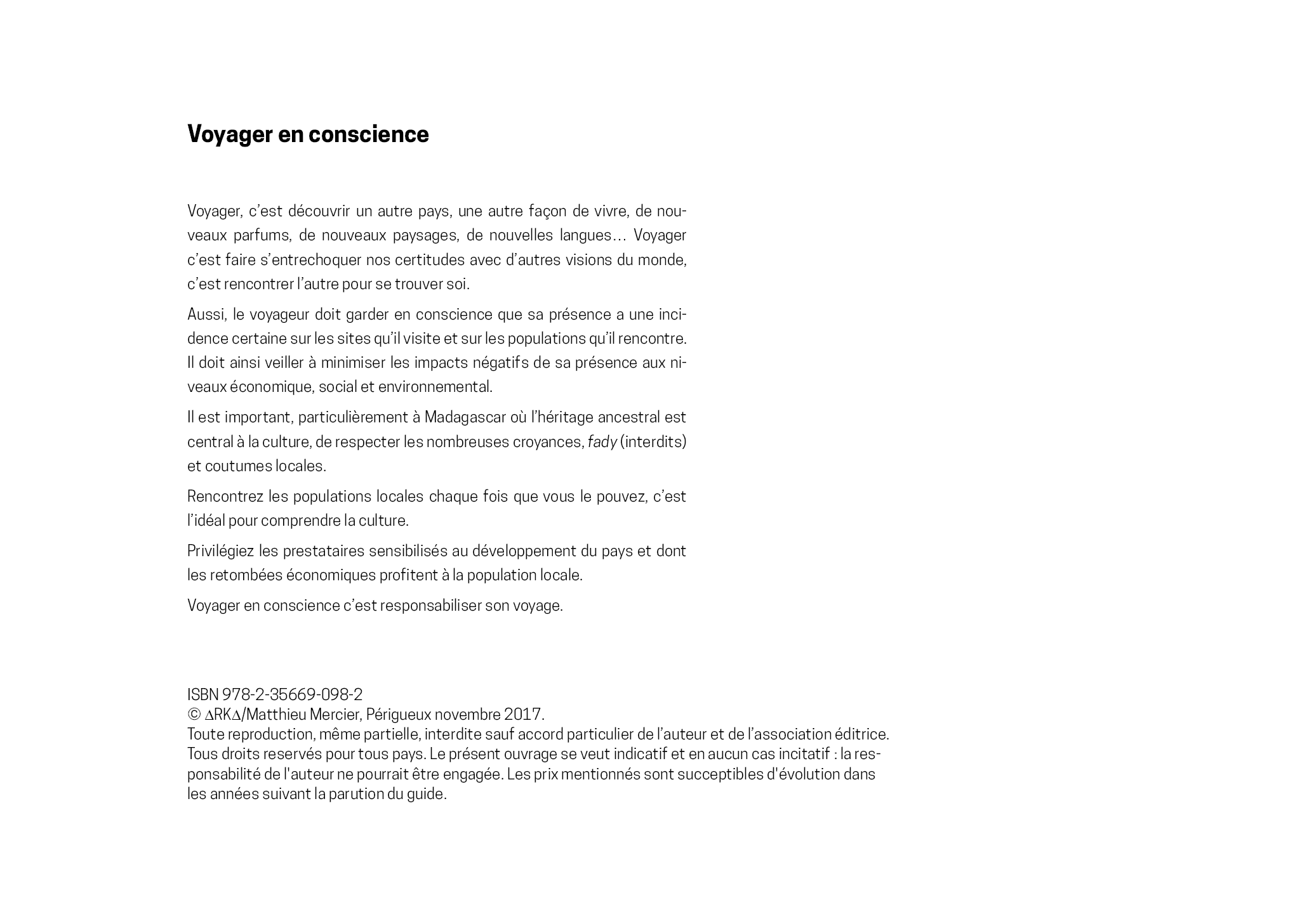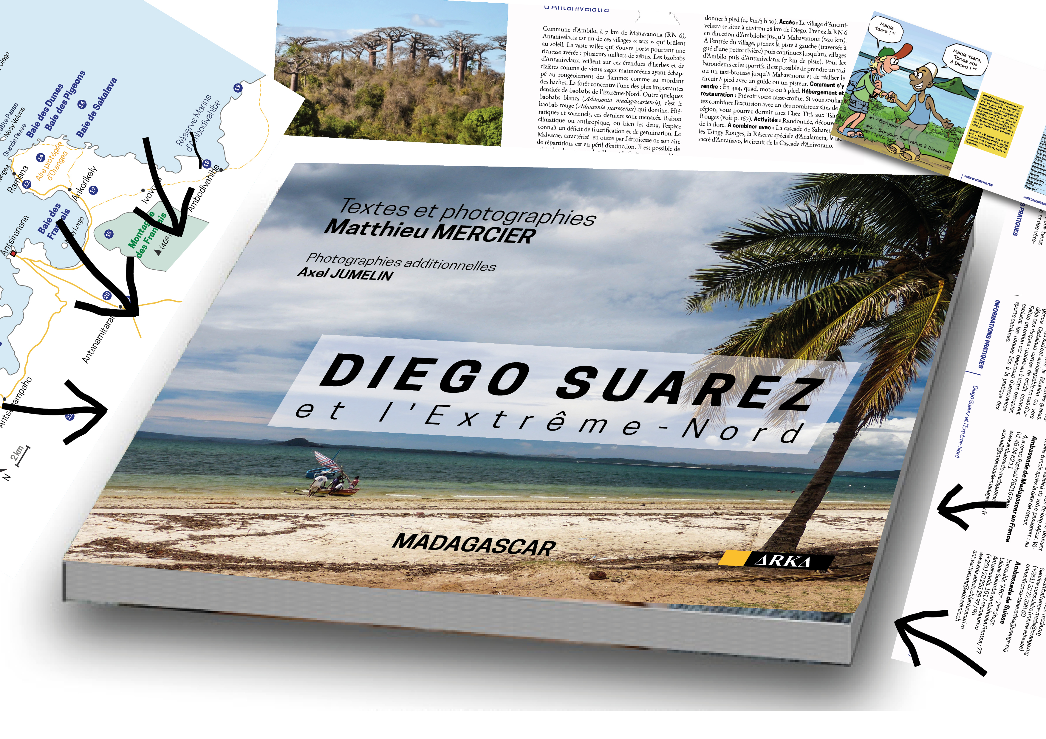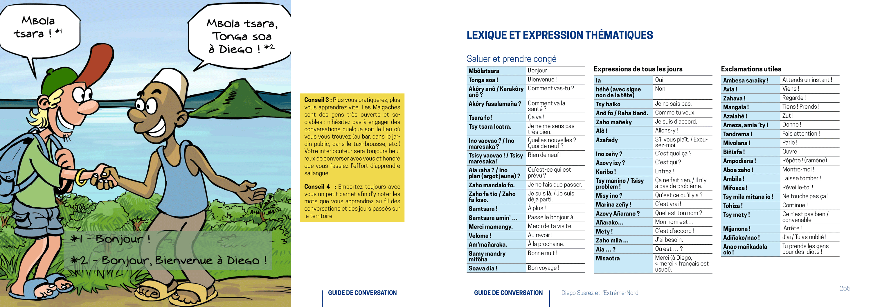 Dans une démarche engagée – puisqu’un véritable voyage ne se conçoit pas sans rencontrer la population locale – un guide d’apprentissage du Malgache du Nord (Sakalava-Antakarana) ainsi qu’un lexique de 1500 mots sont compilés en fin d’ouvrage.