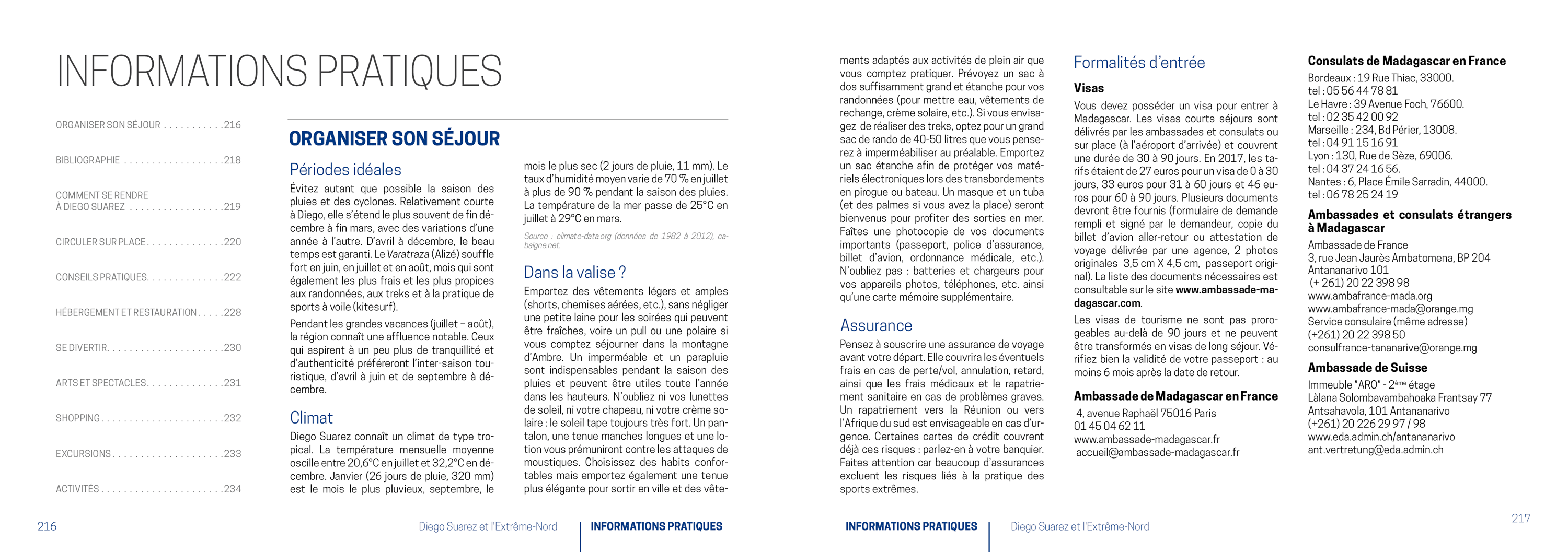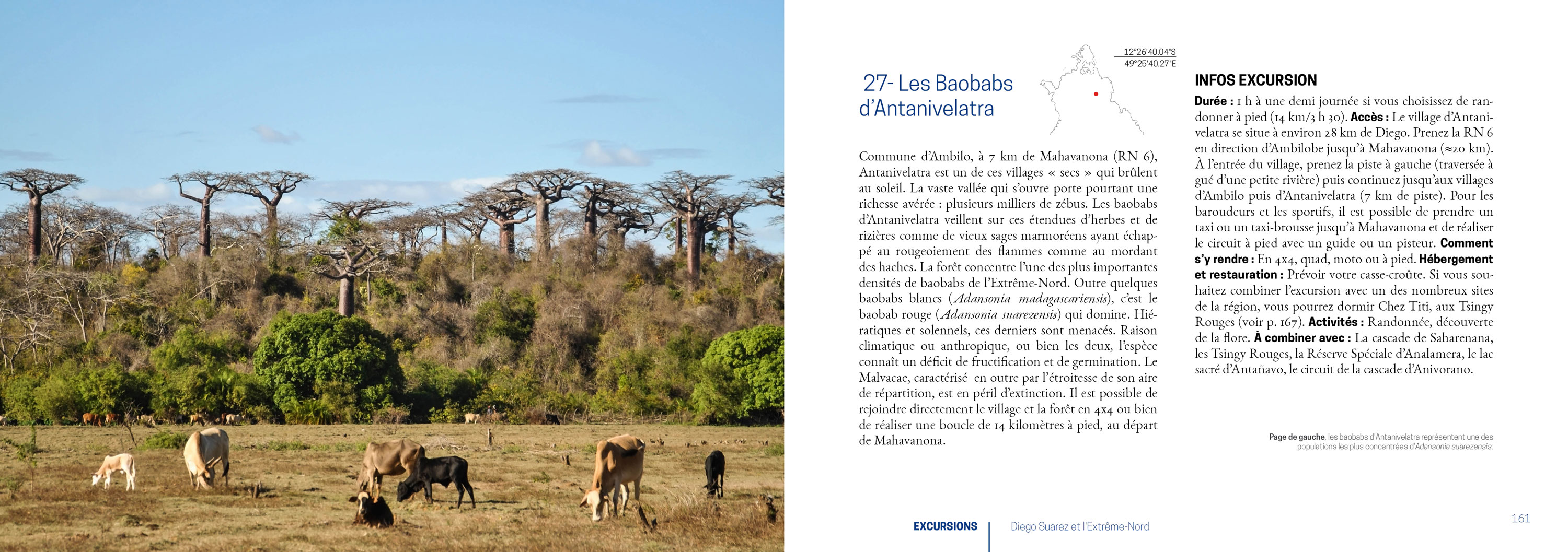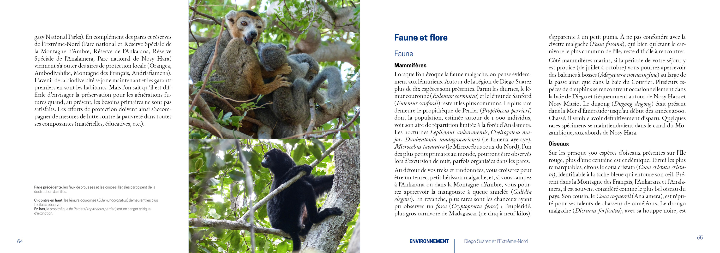 Dans une démarche engagée – puisqu’un véritable voyage ne se conçoit pas sans rencontrer la population locale – un guide d’apprentissage du Malgache du Nord (Sakalava-Antakarana) ainsi qu’un lexique de 1500 mots sont compilés en fin d’ouvrage.
