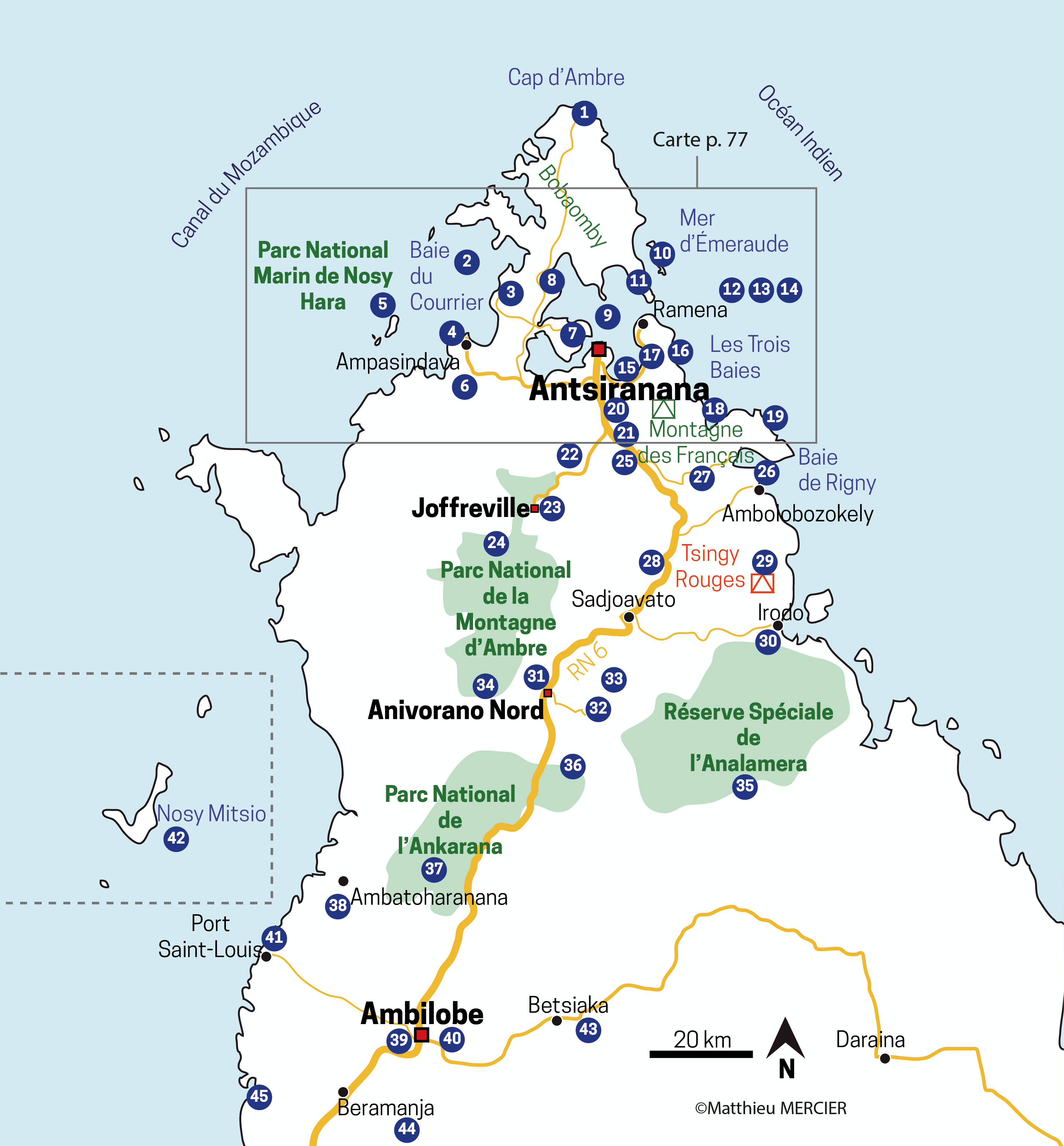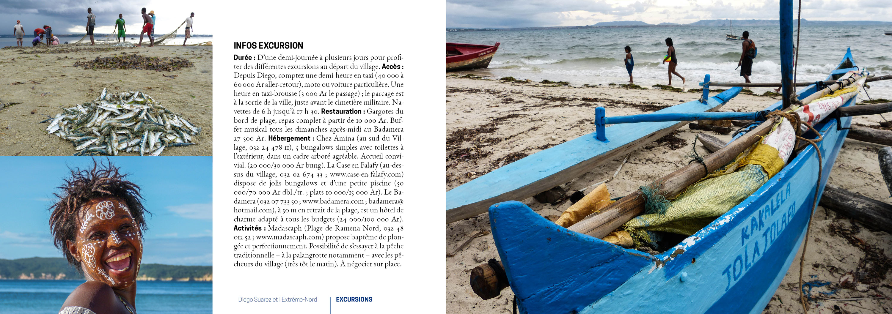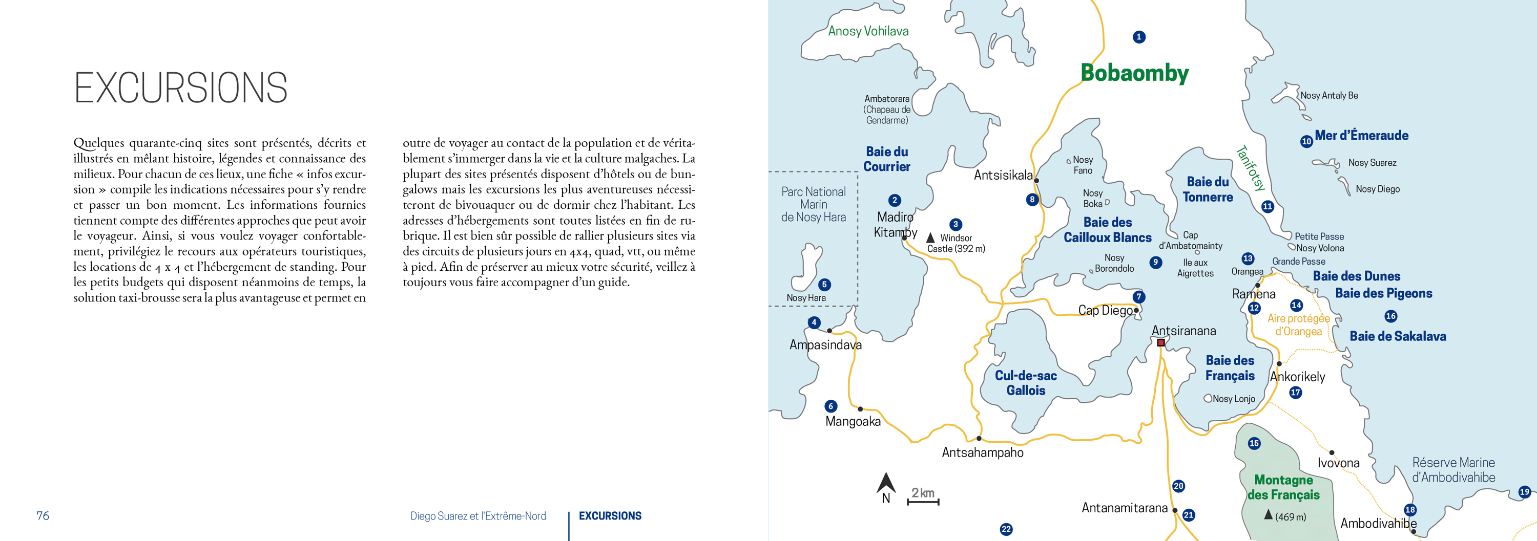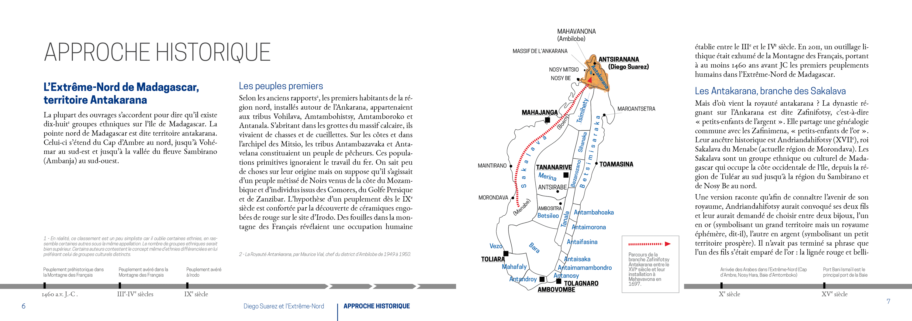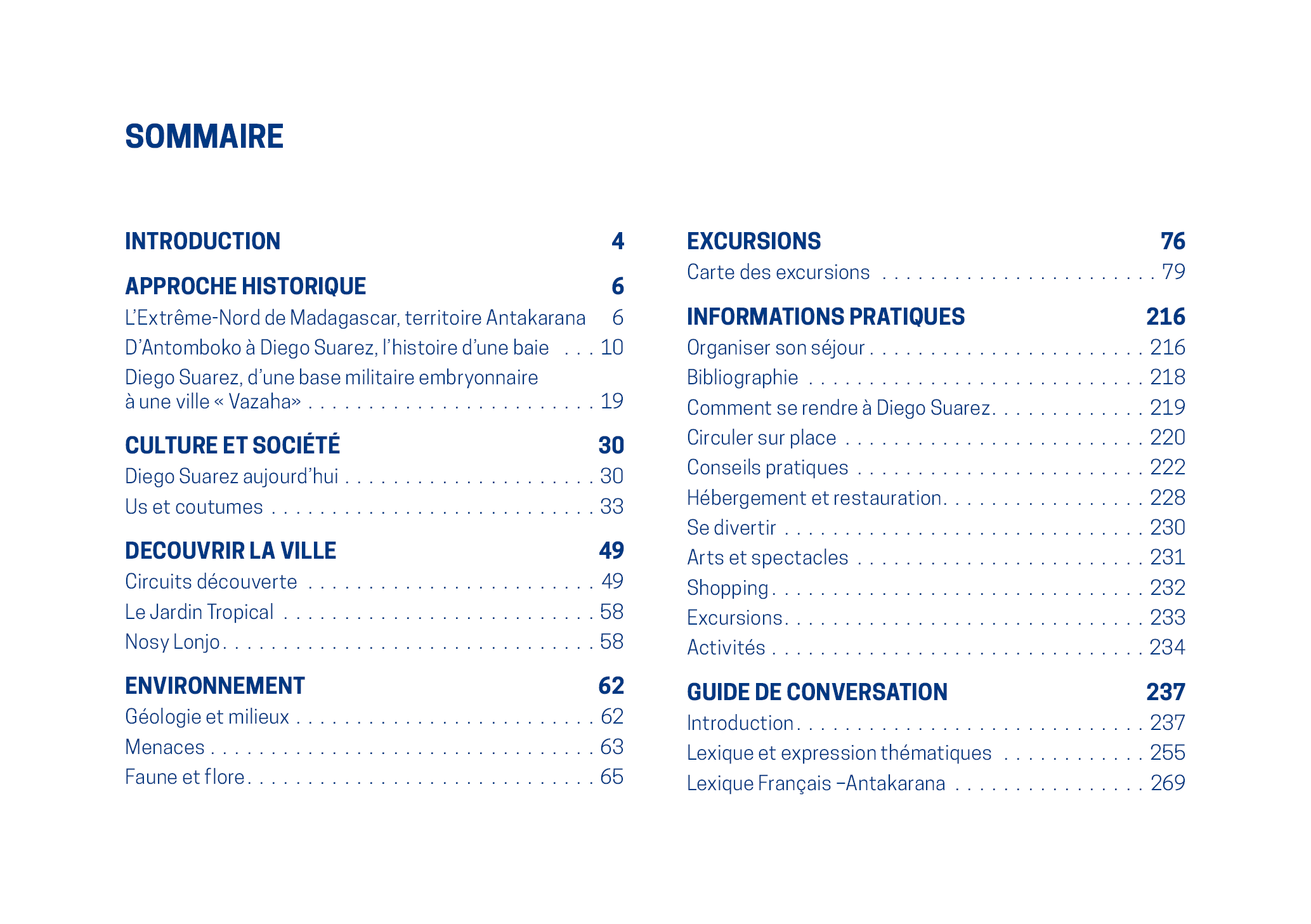 DIEGO SUAREZ et l’Extrême-Nord, en sus de présenter 45 excursions autour de Diego Suarez (d’une durée de 2 h à 2 jours et plus, à pied, en bateau, en pirogue, en 4x4, etc.), aborde l’histoire du territoire, son écologie, sa culture, ses enjeux de société.